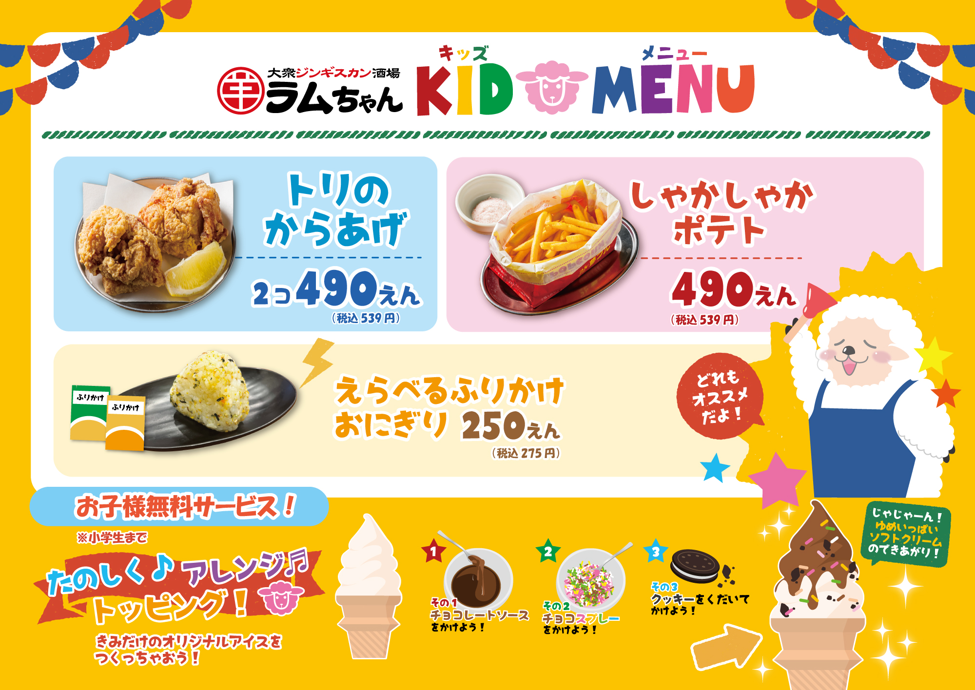 ラムちゃんの一部店舗では、お子様向けメニューも提供しています。ご家族でのお食事シーンに合わせて、より利用しやすい店舗づくりを進めています。